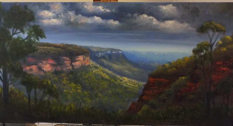 Cliff faces of distant mountains were painted using white and Pilbara red (tinted with more white for the most distant ones). Yellow was added to highlight objects directly hit by sun while for objects lit by day light, white was added to the base color.